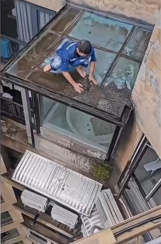 这保洁大哥光这脚在几十层高的楼上打扫卫生,看的真让人心里一紧啊,光着脚还没有任何的保护措施,脚下是打满泡沫的玻璃地面,这要是脚下一滑,这个楼层高度后果肯定是不堪设想啊,大哥以后还是长点心带点安全措施吧[泪奔]