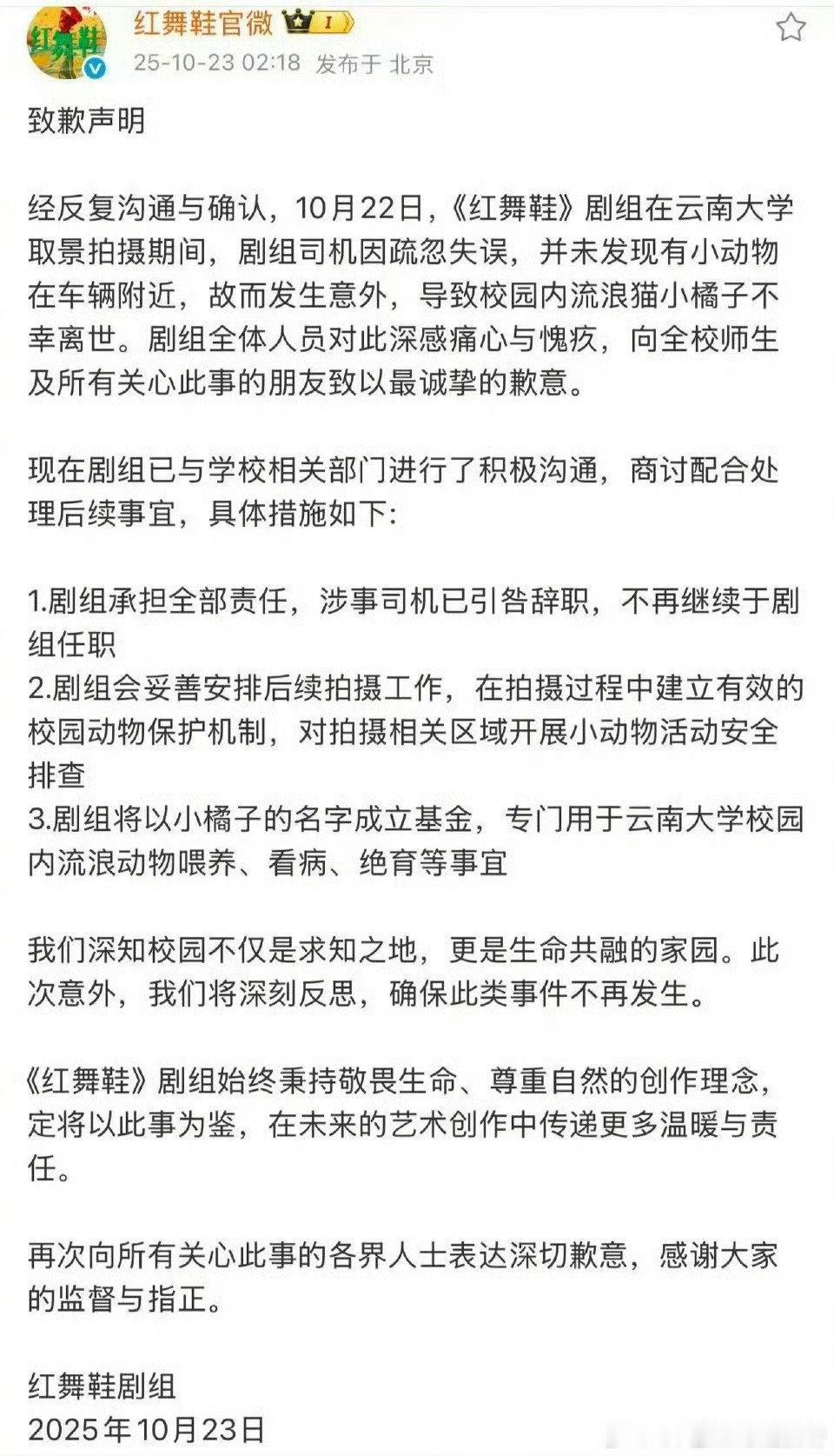 《红舞鞋》官博把剧组在校园里撞死猫的道歉声明删了
