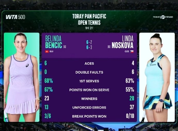 直播吧10月26日讯WTA500东京站决赛,5号种子本西奇以6-26-3完胜6号种子诺斯科娃,夺得冠军!
