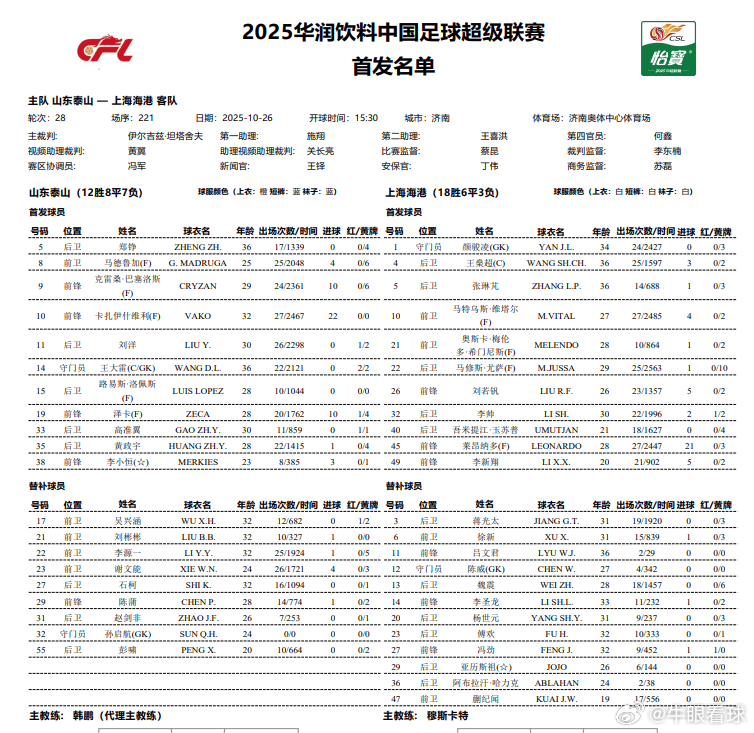 虎扑10月26日讯中超第28轮,山东泰山vs上海海港将于15:30开战,赛前双方公布了首发名单。