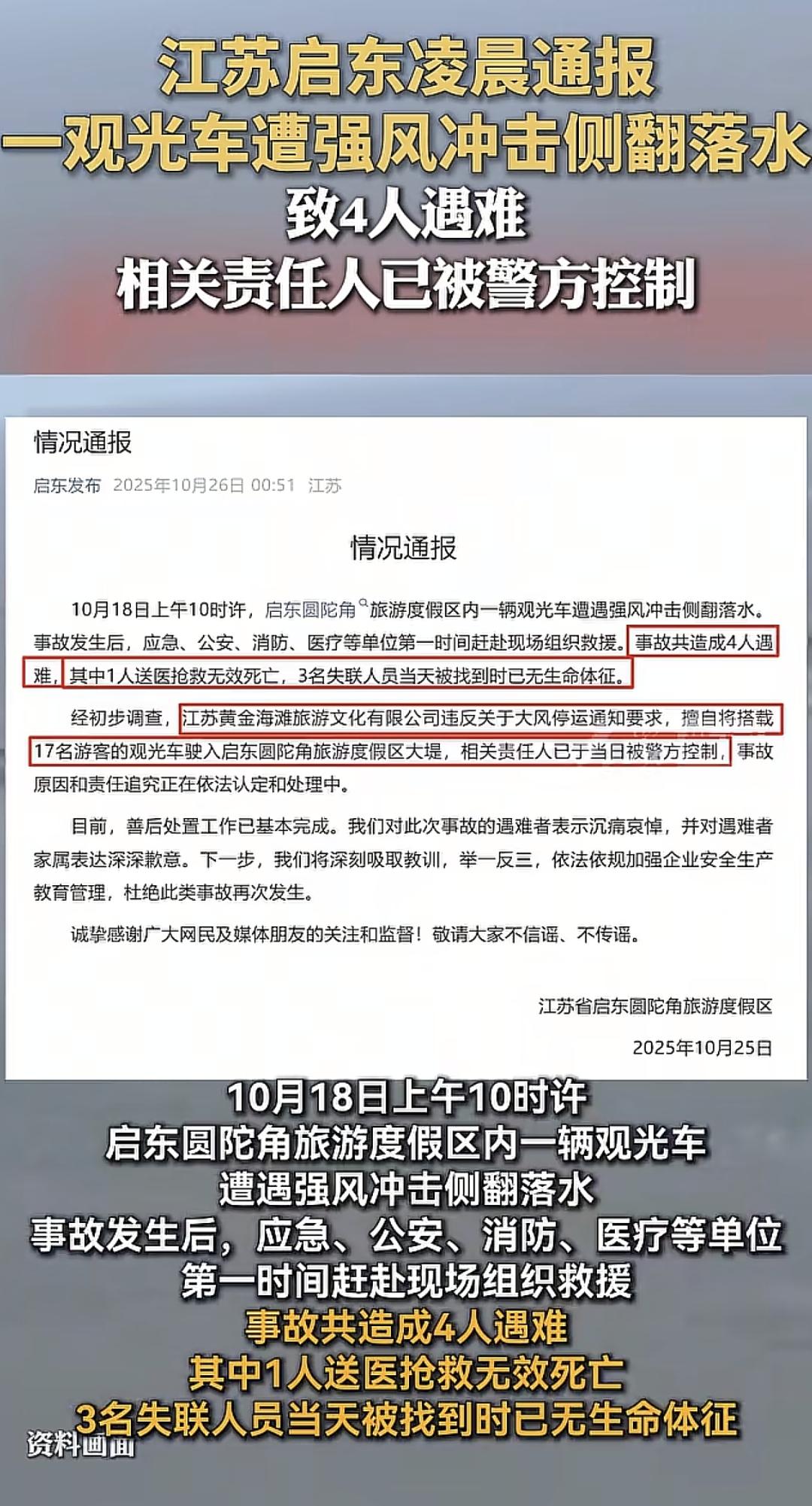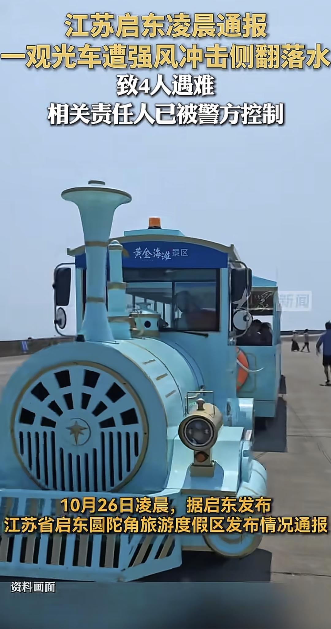 启东这事知情人说“风很大,浪都打上来了”,景区管理人员也说“景区暂停营业,具体营业时间不确定”,当天风力9级大,真是一个敢开一个敢坐 我就想问问这个景区这么缺钱吗? 没完成的行程不能往后延下或者将项目折现退钱给客人? 居然无视大风停运要求,擅自将搭载了17名游客的观光车驶入启东圆陀角旅游区大堤,最后导致大风将观光车冲翻落水,4人遇难,这还是不幸中的万幸了,还有13个人捡回来一命! 有记者采访获救老人,他说自己抓住稳固物体,在水里等了2.5小时才被救上来,太可怕了! 当地人说这哪是什么海滩,一眼望不到头的淤泥,不知道有什么看头的,这旅游公司也是厉害,把海滩圈起来营业,不需要围的岸边全用铁网围住,需要安全围栏的不围,真是奇怪,这事必须狠狠地处罚,正下风气!