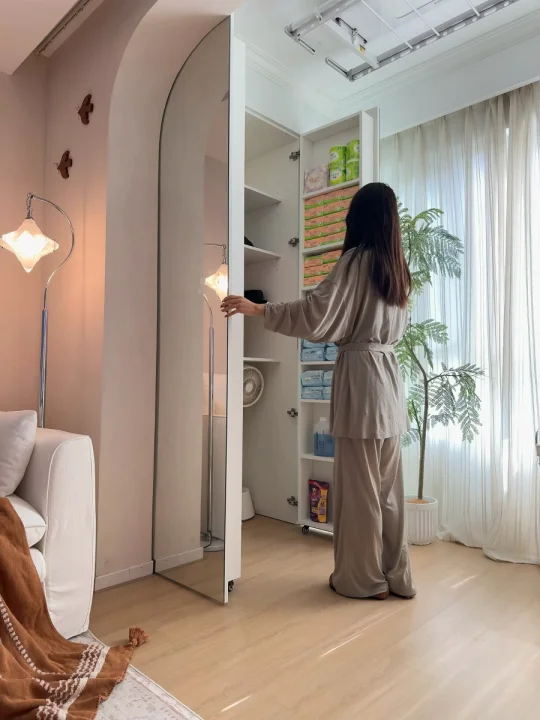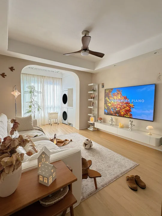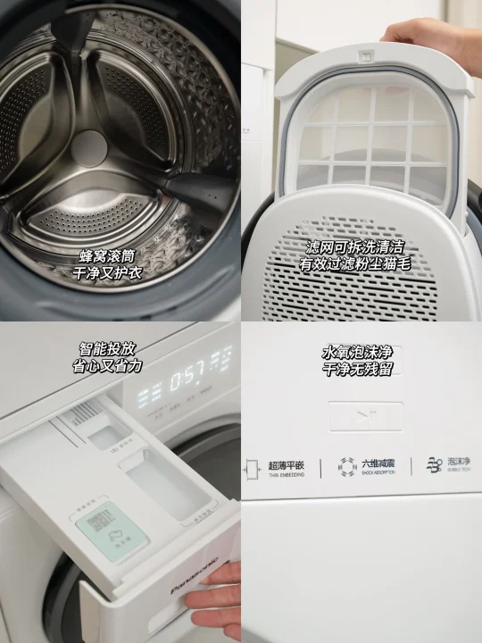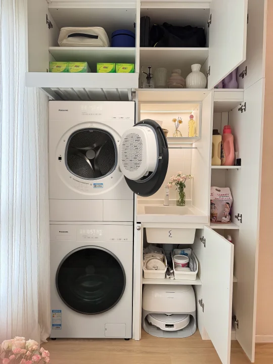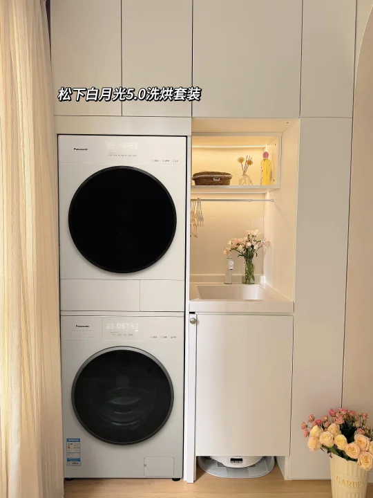 人生第一套房,从毛坯到新家,没请设计师,一点一滴自己装修改造。这个68㎡的小家,陪了我三年,也看着它慢慢变成理想中模样✨。 68㎡的家不大🏠,所以硬装中我秉持这显大、实用、美观的思路,将每一寸都精打细算。简约不压层高的双眼皮吊顶,延伸空间感的地板通铺,还有最不后悔的,坚持打通了阳台封窗✅——让原本压抑的小客厅瞬间开阔明亮起来🔆。 但小户型阳台空间本就有限❌,一想到堆满衣服,采光与氛围全被淹没🤦🏻‍♀️,尤其碰上梅雨季,衣物晒不干闷出馊味,幸福感真的会直线下降↓。 所以我们决定装洗烘套装,来从根源解决晾晒难题。最终选定松下白月光5.0洗烘套装,机身仅590mm厚,能严丝合缝嵌入我预留的600mm柜体中,美观整洁,也不多占一寸空间✌🏻。 💛洗净力让人安心:它的水氧泡沫净技术能催发高活性泡沫🫧,咖啡渍、油渍无需费力预处理就能洗得干干净净。特别让我放心的是水氧防过敏功能,它能将水氧分子深入纤维,彻底清除藏匿的过敏原,洗完无残留,宝宝👶🏻和我的贴身衣物都能安心穿。 💛毛絮洗烘透彻无残留:对于养宠家庭,它能通过除毛洗“浸、摔、剥、冲、漂”五大步骤→把毛屑与衣物深度分离,再通过深度除毛烘2.0➕三重线屑收集系统,将毛发、粉尘一网打尽。而且大风量垂直送风能快速带走湿气💧,烘得又匀又快,衬衫都能保持平整免熨烫。 💛智能护理超省心:洗衣液智能投放不用洗一次加一次省心又省力,而且像羊毛、羽绒等娇贵面料也有专属程序,在家就能得到专业级护理,省下不少干洗的时间⏰和金钱💰。 现在洗衣不用看天气☁️,每一天都有蓬松干爽的衣服穿,阳台不再被衣物占据,变身洒满阳光的休闲角落🌞。 另外阳台对面,我还定制了一整排“冰箱式”收纳柜,家中杂物、日常囤货都能整齐藏入。柜面选用镜门设计,不仅在视觉上延伸空间感,也让小阳台更显通透、明亮🔅。 靠着这些精心的设计,让我这个68㎡的小家,也能住出大平层的开阔与从容幸福感🥰。