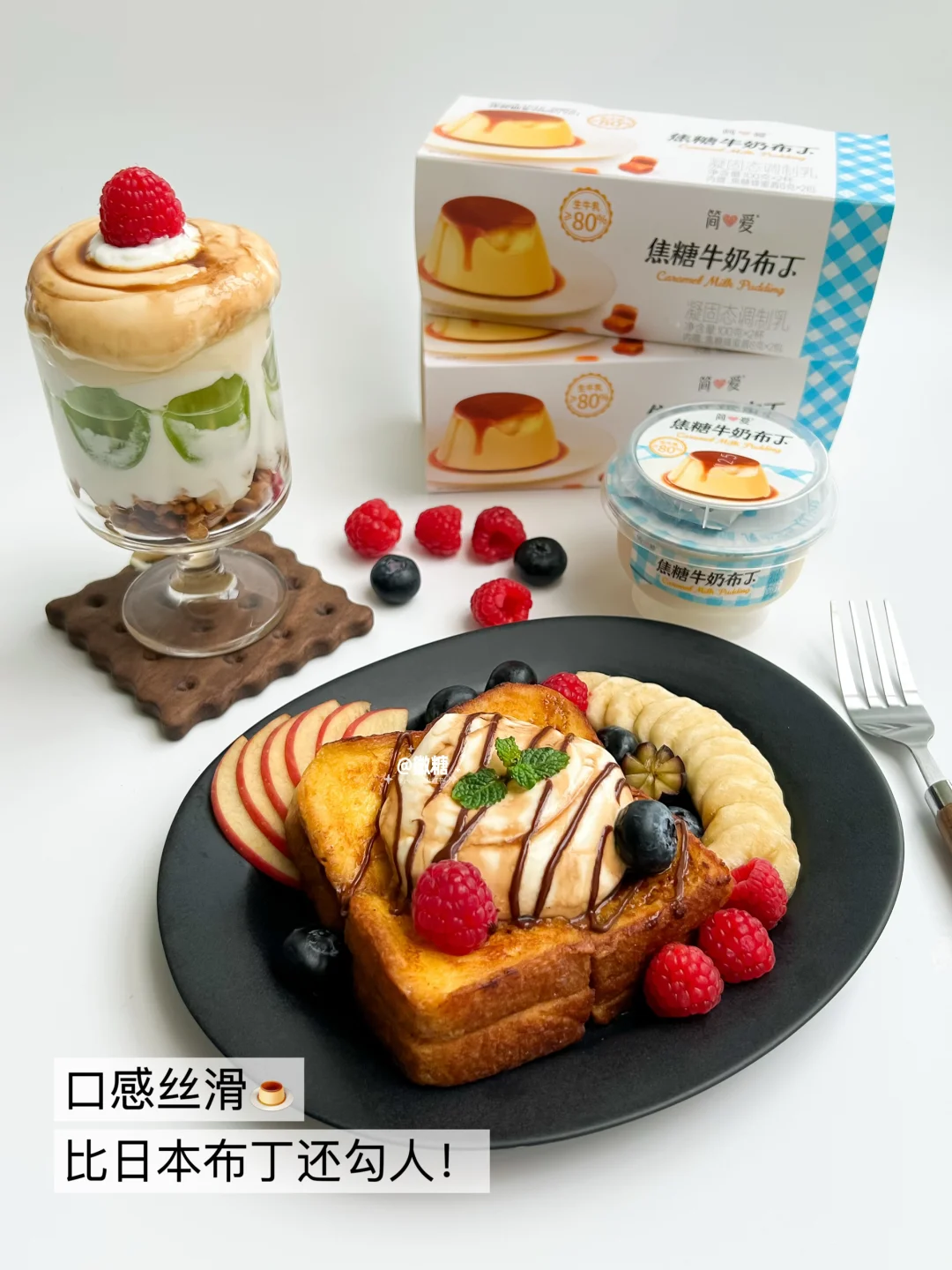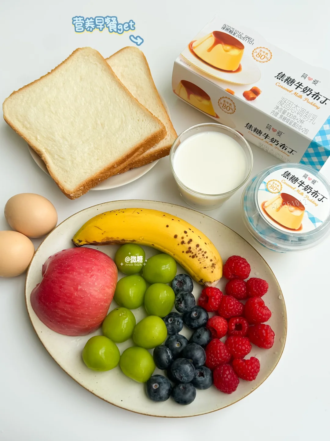吐司,牛奶,鸡蛋,黄油,水果,巧克力酱,简爱焦糖布丁