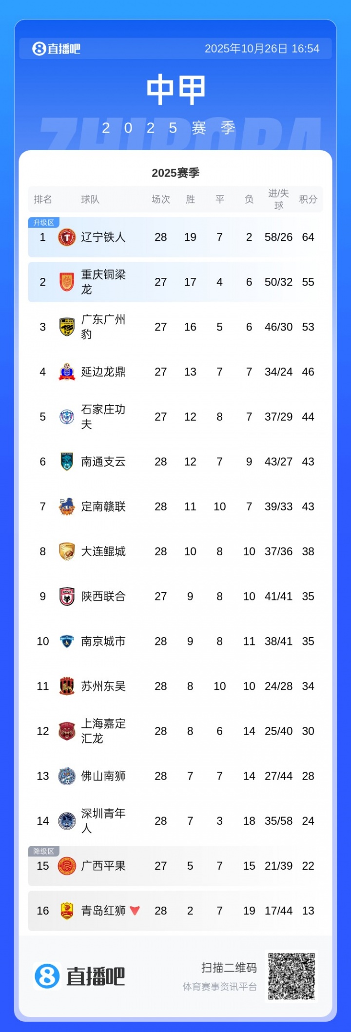 直播吧10月26日讯中甲第28轮本周末打响,在刚刚结束的一场比赛中,辽宁铁人战胜南通支云锁定本赛季中甲的一个升超名额,同时也锁定本赛季中甲冠军。