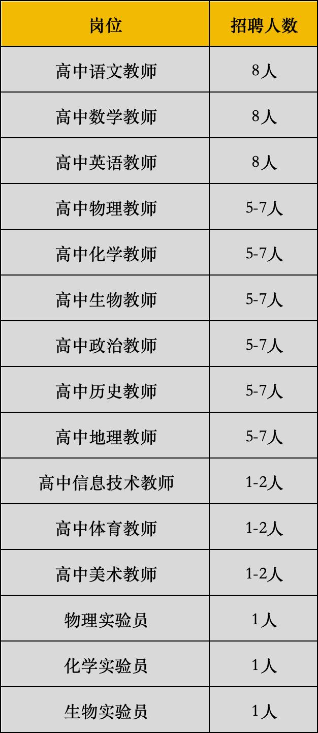 这次学校面向全社会招聘全学科的优秀毕业生和在职教师近70人,均有编制。其中语数英各8人,物化生政史地各5-7人,技体艺各1-2人,物化生实验员各1人。