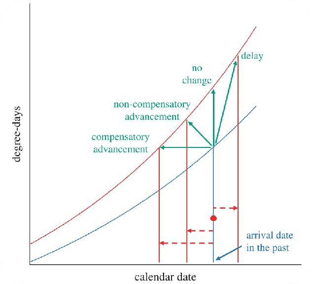 相对气候和物候变化对候鸟生态错配的潜在影响。候鸟只有大幅提前到达日期才能完全弥补气候变化带来的影响(Sainoetal.2010)。