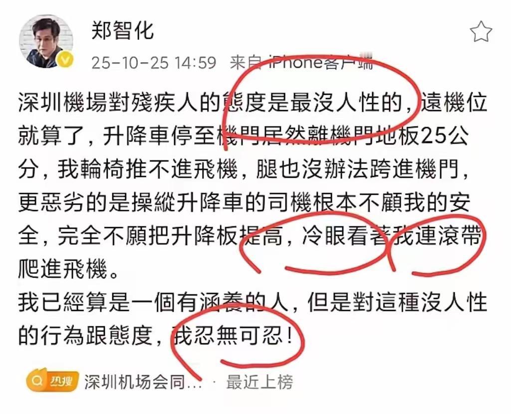 郑智化这波吐槽登机的事有点翻车,原本说机场“没人性”“冷眼”,结果机场直接晒出了服务细节。 他说登机时升降车离机门25厘米,轮椅推不进只能连滚带爬,可机场查了,是前序航班多占了近机位,只能安排远机位用登机车。为防设备刮飞机,按安全规范得留20厘米高度差,最后还有地服和机组两个人帮忙,他才安全上了飞机。 机场也没赖账,马上说以后轮椅旅客优先用廊桥,远机位的话保障人员从1个加到2个,还试点新的连接装置解决高度差。他后来也松口了,说不追究了,就希望机场优化残疾人服务。 公众人物吐槽服务问题能理解,可说话前是不是该先弄清楚情况,别让情绪把事实带偏了?