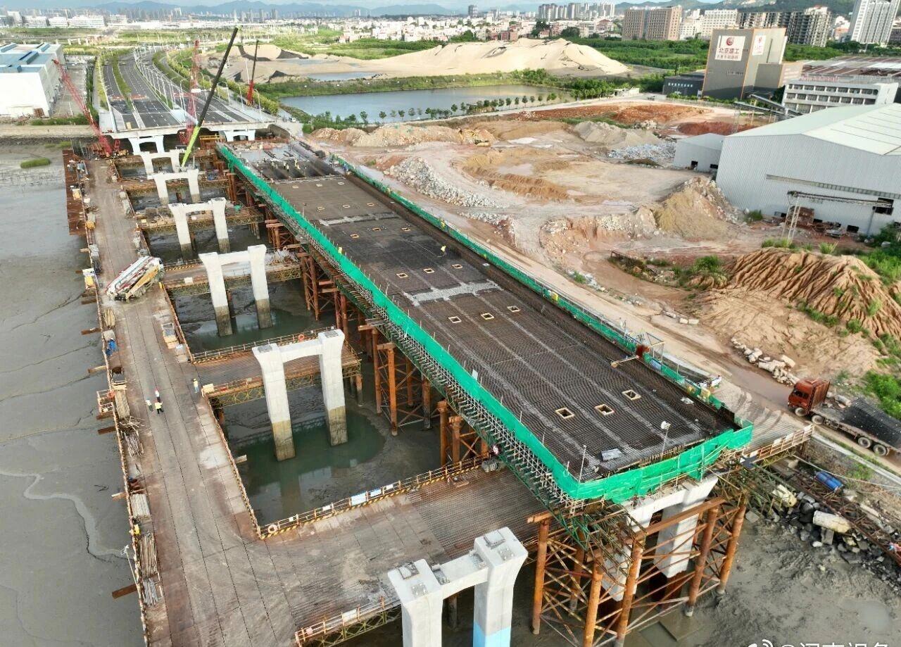 记者了解到,滨海大道翔安连接线工程项目总投资为34055.36万元,由南翼集团建设、中交上航局承建。项目位于南安市石井镇菊江村菊江码头附近,毗邻厦门市翔安区,起点顺接厦门翔安滨海东大道桥梁,终点止于南安滨海大道。 桥梁总长685米,桥梁断面采用双向六车道,桥梁宽度为32米。上部主梁采用预应力混凝土连续现浇箱梁,双幅桥面,单幅桥宽15.5米—24米,双幅间距1米—4米。主要工程包括栈桥工程、桩基工程、承台工程、墩柱工程、箱梁工程等。