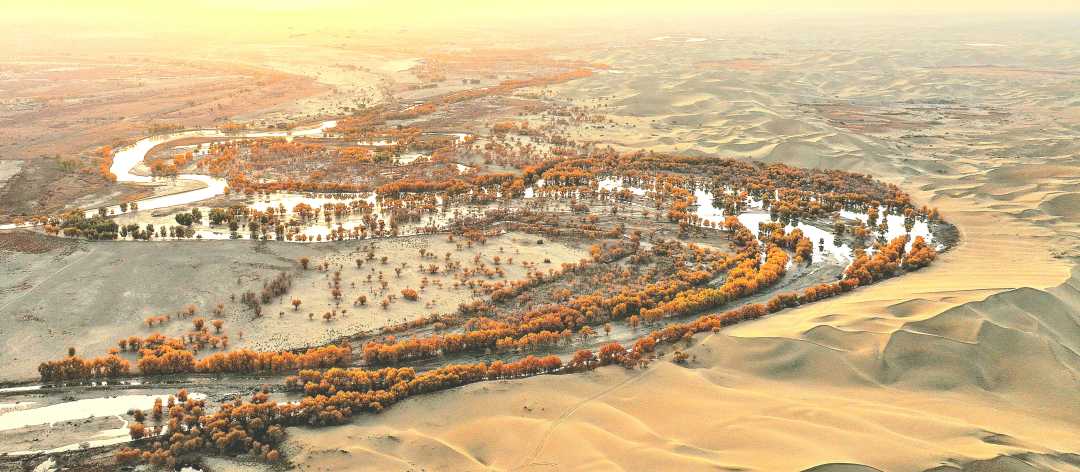 10月26日,新疆巴音郭楞蒙古自治州尉犁县塔克拉玛干沙漠边缘,塔里木河蜿蜒流淌,胡杨林披上“金装”。深秋时节,塔里木河流域胡杨林进入最佳观赏季。