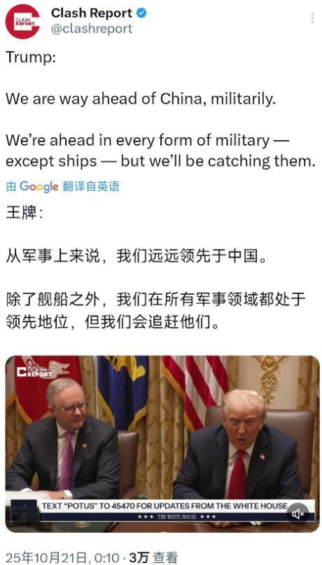 特朗普北京时间10月21日表示:“从军事上来说,我们远远领先于中国。除了舰船之外