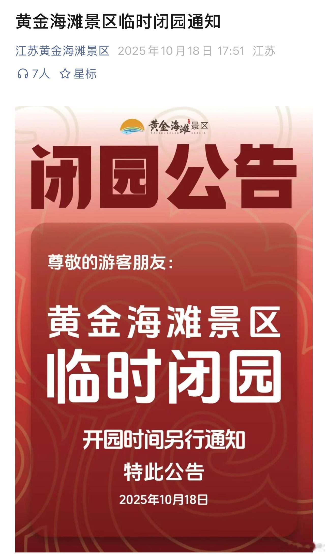 启东市气象台曾在10月17日,发布海区大风黄色预警信号。10月18日下午近6时,黄金海滩景区发布临时闭园通知,但未说明原因,称开园时间另行通知。