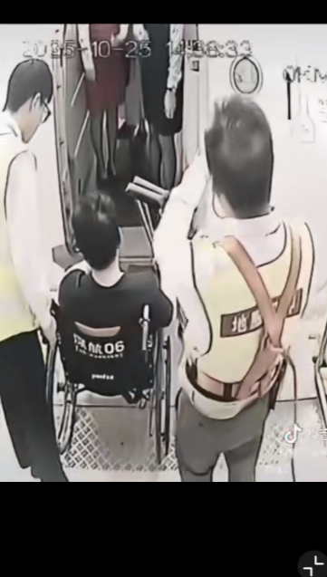 这段视频长达一分多钟,从他的轮椅进入登机口的这一瞬间,一直到里面去,全程都有两名工作人员以及里面的工作人员在接应。