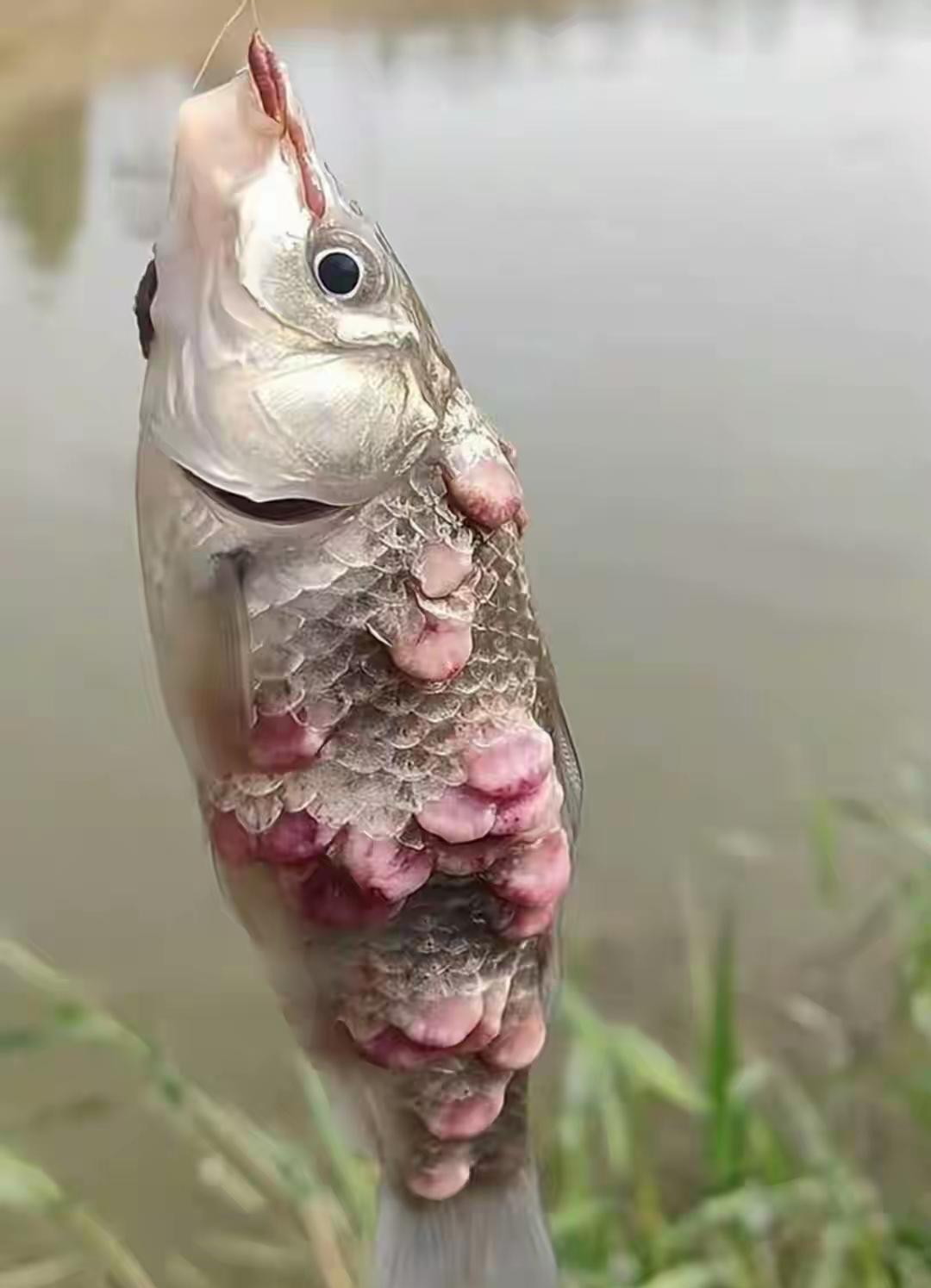 身上长花的鱼你见过吗 一网友就去钓鱼,就钓上这么一条怪鱼,一提杆就觉得不对,跟以往颜色不一样啊,眼看着带着花就上来了 再仔细看,这哪是花,这是生病了啊,至于是什么病,还真搞不清楚