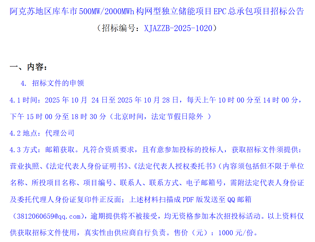 储能与电力市场获悉,近日,新疆阿克苏地区库车市500MW/2000MWh构网型独立储能项目EPC总承包项目发布招标公告。