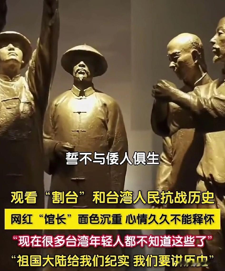 网红馆长陈之汉参观抗日战争纪念馆, 观看“割台”和台湾人民抗战历史后, 心情沉重,他是怎么评论的…… “甲午战争爆发,当时北洋水师在作战中全军覆没,被迫签订《马关条约》,赔款两亿三千万两白银,将台湾以及澎湖列岛割让给日本。“马关割台”的消息传来呢,全台赤子誓不与倭人巨俱生。现在你们年轻人念书都没有,我们祖国大陆都帮我们纪实了。所以我们还是要讲历史,真的是这样。”陈之汉这么感慨道。 10.25日台湾光复纪念日《澎湖海战》发布预告片和致敬歌曲。2012年上映的电影《德赛克•巴莱》更是直接描述了1930年台湾原住民反抗日本军队的事件,很多真实历史事件都说明了两岸本是一家人。 网红馆长用自己的一言一行在唤醒被蒙蔽真相的台湾民众,而台独分子妄想篡改教科书,让子孙后代遗忘历史。 澎湖海战