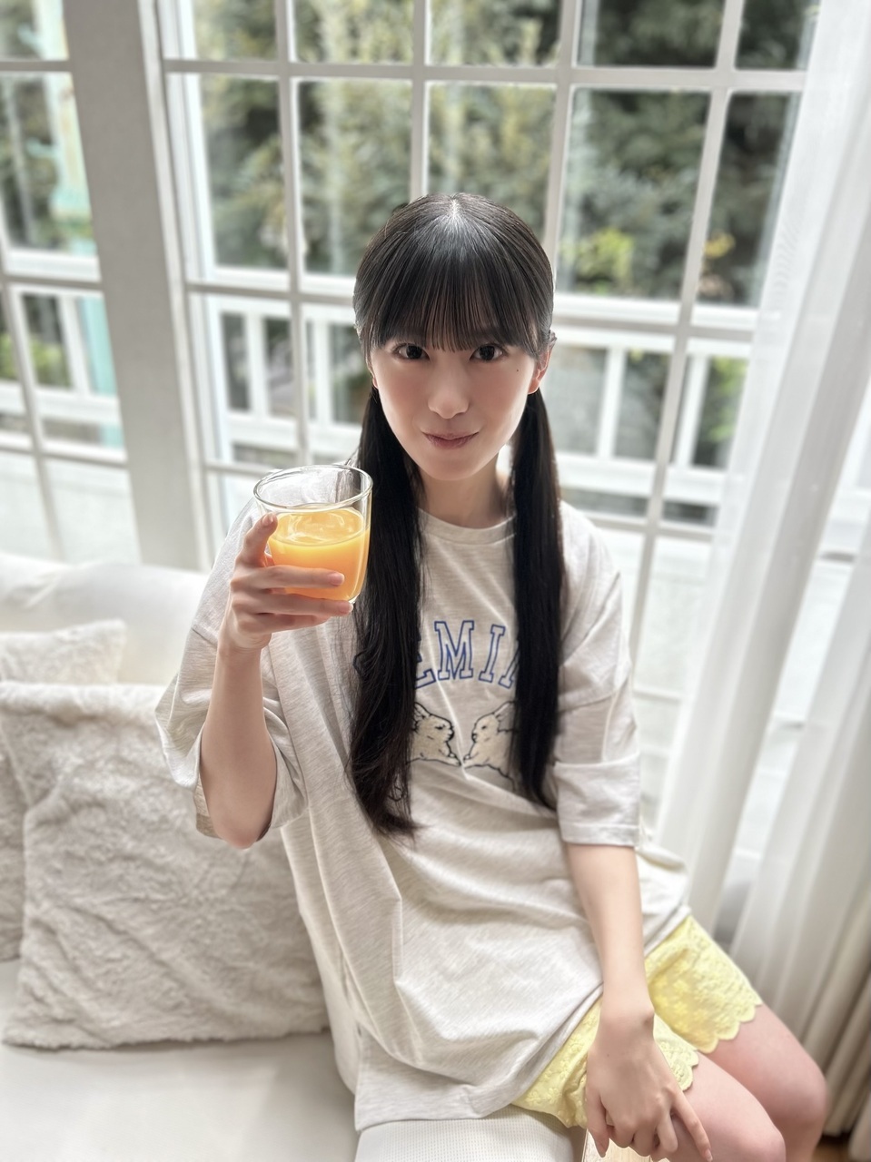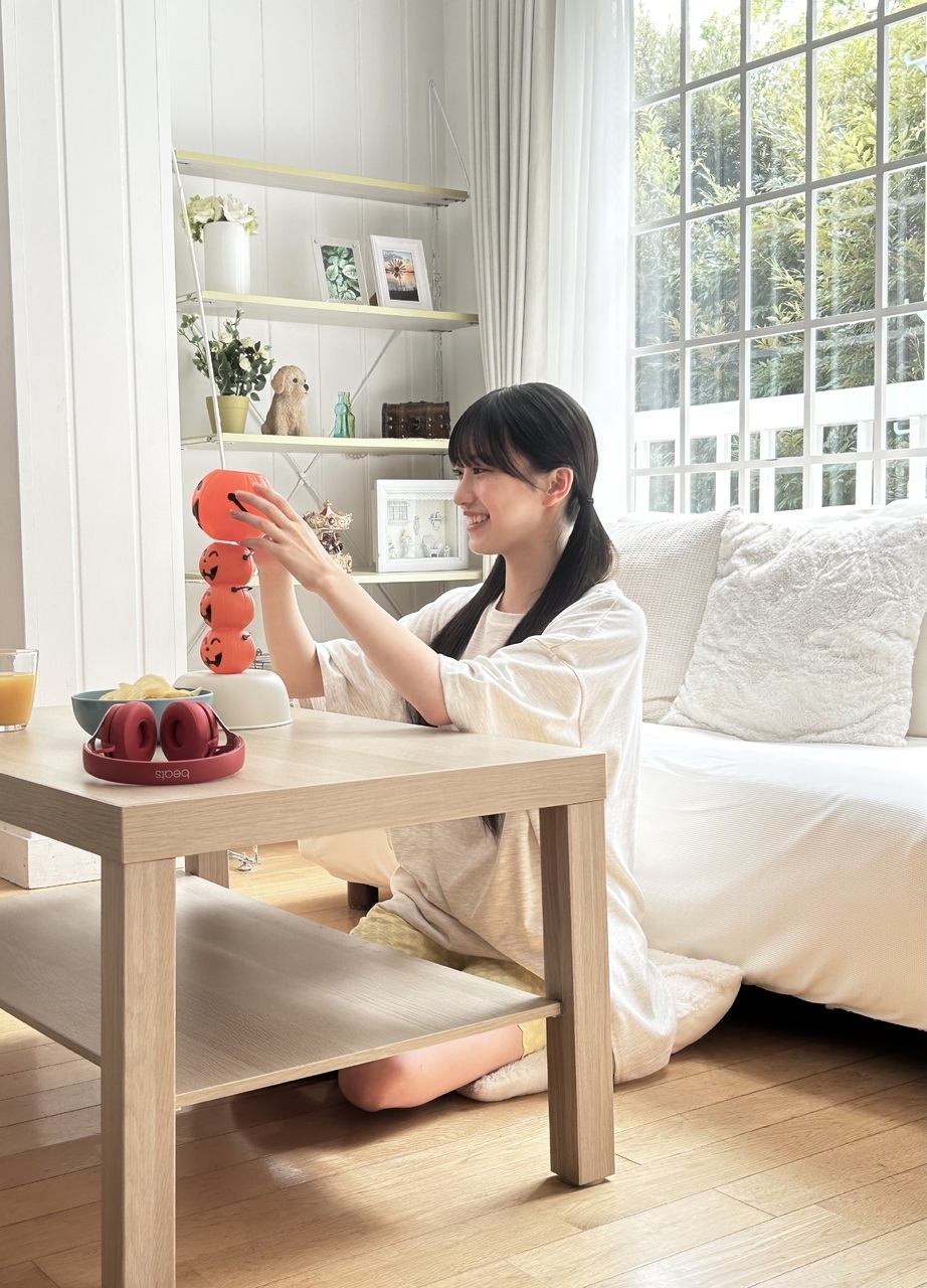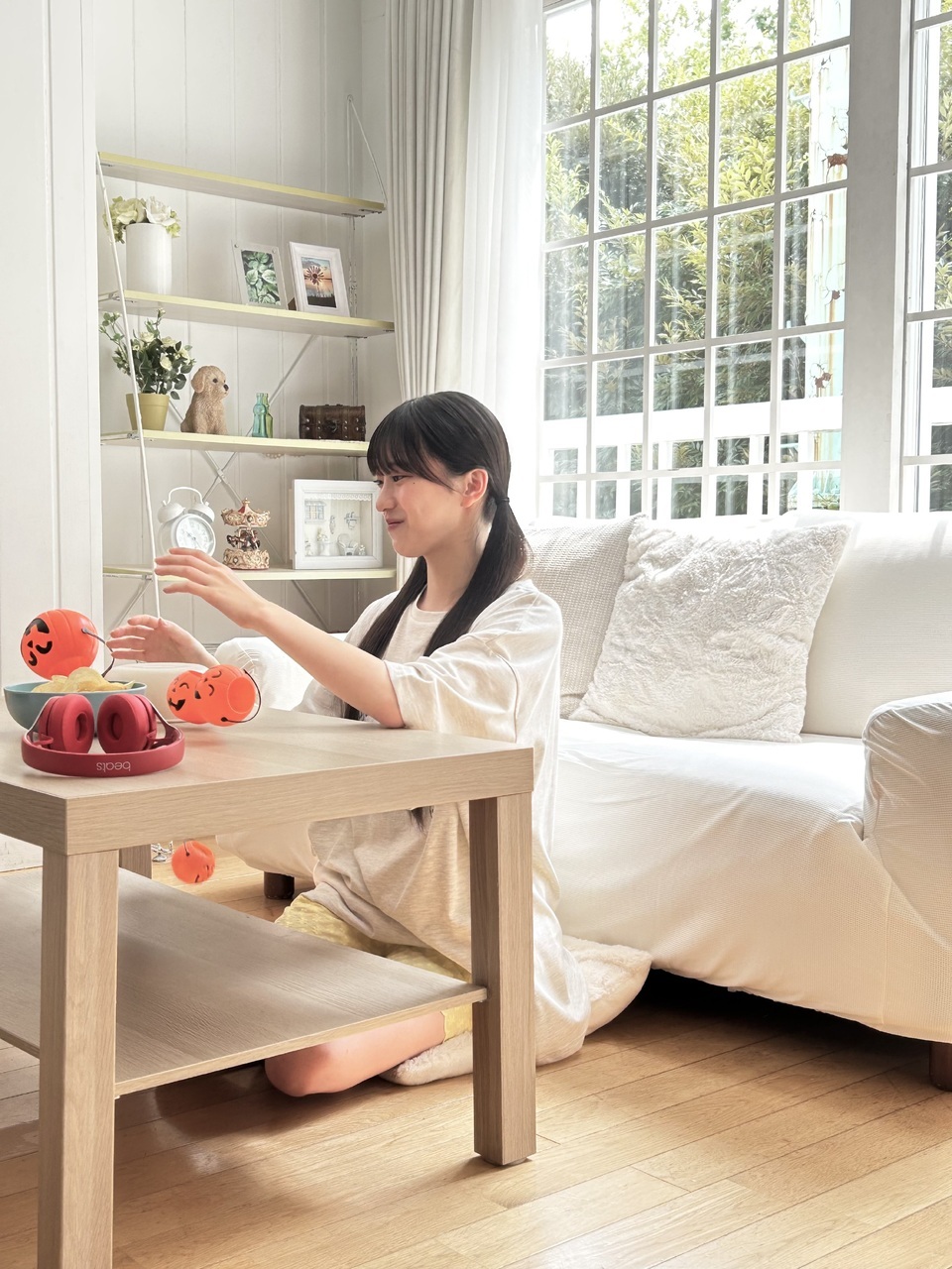 村井優「カボチャを積む挑戦をしたよ。乗せられるかな。 おっ いけそう。 あっ 崩れたぁーー。4コマ漫画みたいでした笑 ちなみに、このうさぎさんのTシャツは撮影が終わった後にいただきました。私のパジャマになってお家で着ているよꪔ̤̮ ぜひ、手に取っていただけたら嬉しいです୨୧」