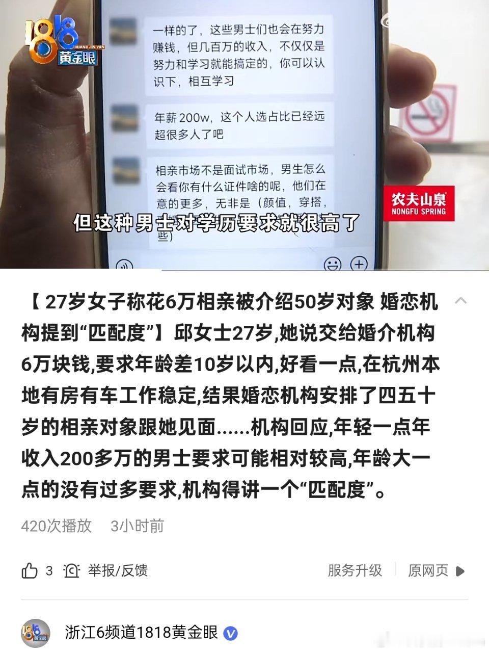 总结:女方要求在杭州本地有房有车,工作稳定的男生,还要37岁以内,年收入200万,还要长得好看一点的。机构也是不怕得罪客户啊,这种相亲要求也敢接?最后还真能找到50岁的匹配度对象,也是拼了老命了。真不容易啊.....[哆啦A梦吃惊][哆啦A梦吃惊]