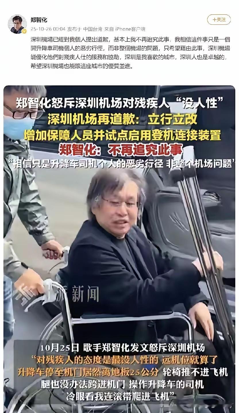 有人站队郑老师!他十年前,右腿手/术,拄拐,舷梯25cm高,爬上一半差点摔倒,只能左腿单腿跳上去,而郑老师双腿无力,所以很难“跨”过去,只能靠手臂的力量, 机场轮椅很宽,只能到舷梯口,又窄又陡的通道,又根本不能站2人,所以机场“黄马甲”想上去搀扶也不可能, 看郑老师,实在用不上力,工作人员在他后面,硬推,周/屁股,才帮着弄上去, 可能这段经历,在郑智化眼中,满是羞愧,用“连滚带爬”形容,也不过分! 关于郑智化能拄双拐唱歌,那是在舞台比较宽松的情况下, 当时舷梯口,这么窄的过道,根本不允许用双拐支撑!! 从残疾人角度,确实是这样! 所以才会有深圳机场“再道歉”一事! 70.80年代,的中年人,曾听着《水手》,中经典句子,他说风雨中这点痛算什么,擦干泪不要怕,至少我们还有梦”! 现在年轻人有几人知道?