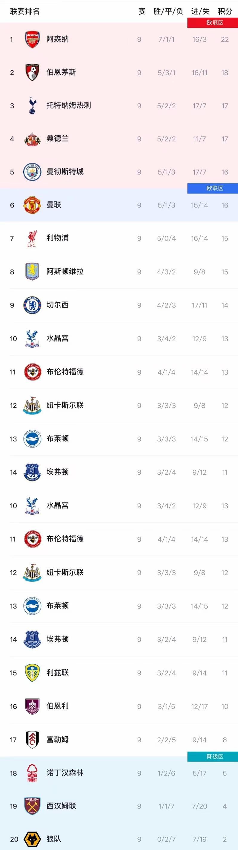 虎扑10月27日讯英超第9轮战罢,本轮多场焦点战爆出冷门,积分榜格局再次发生变化。