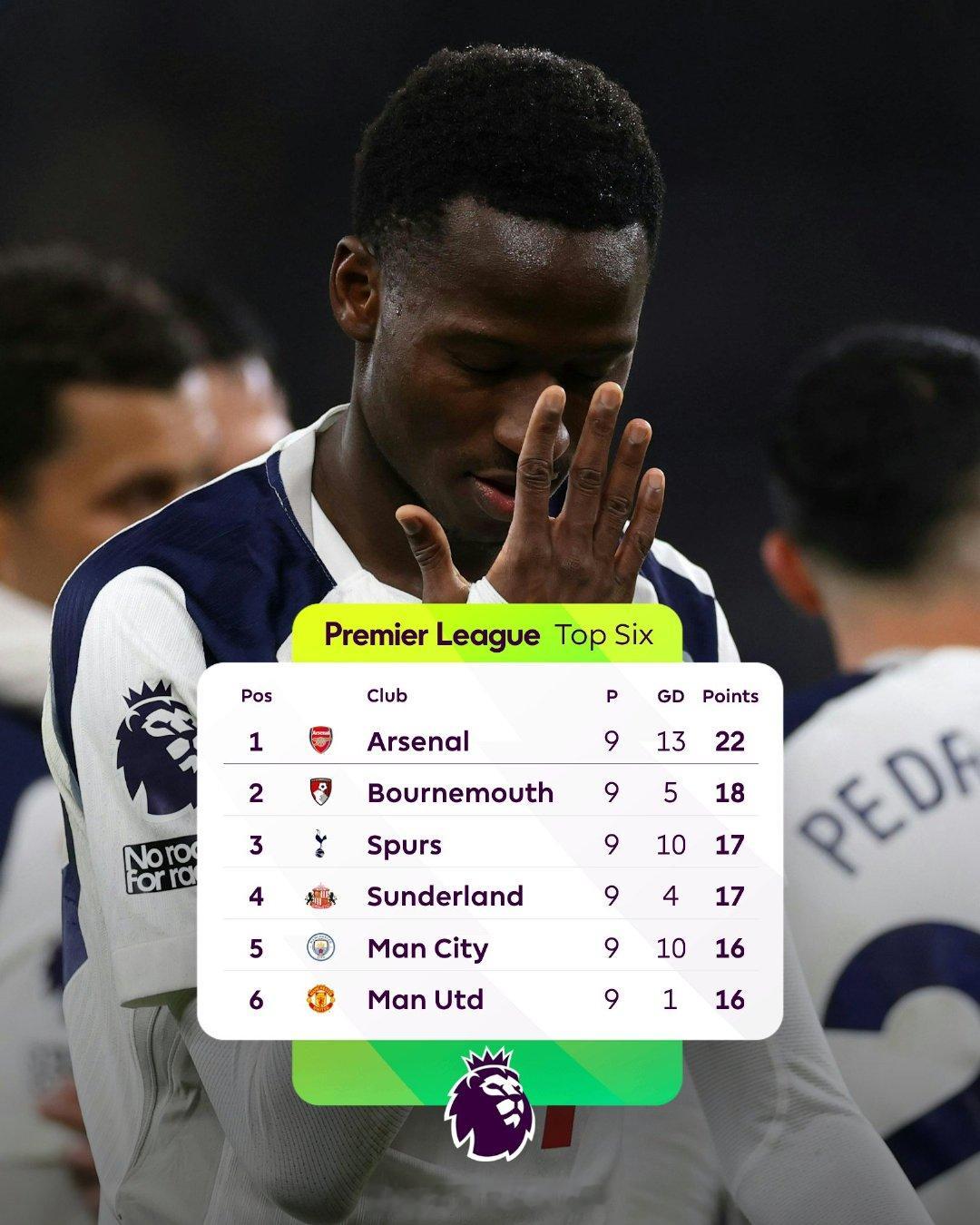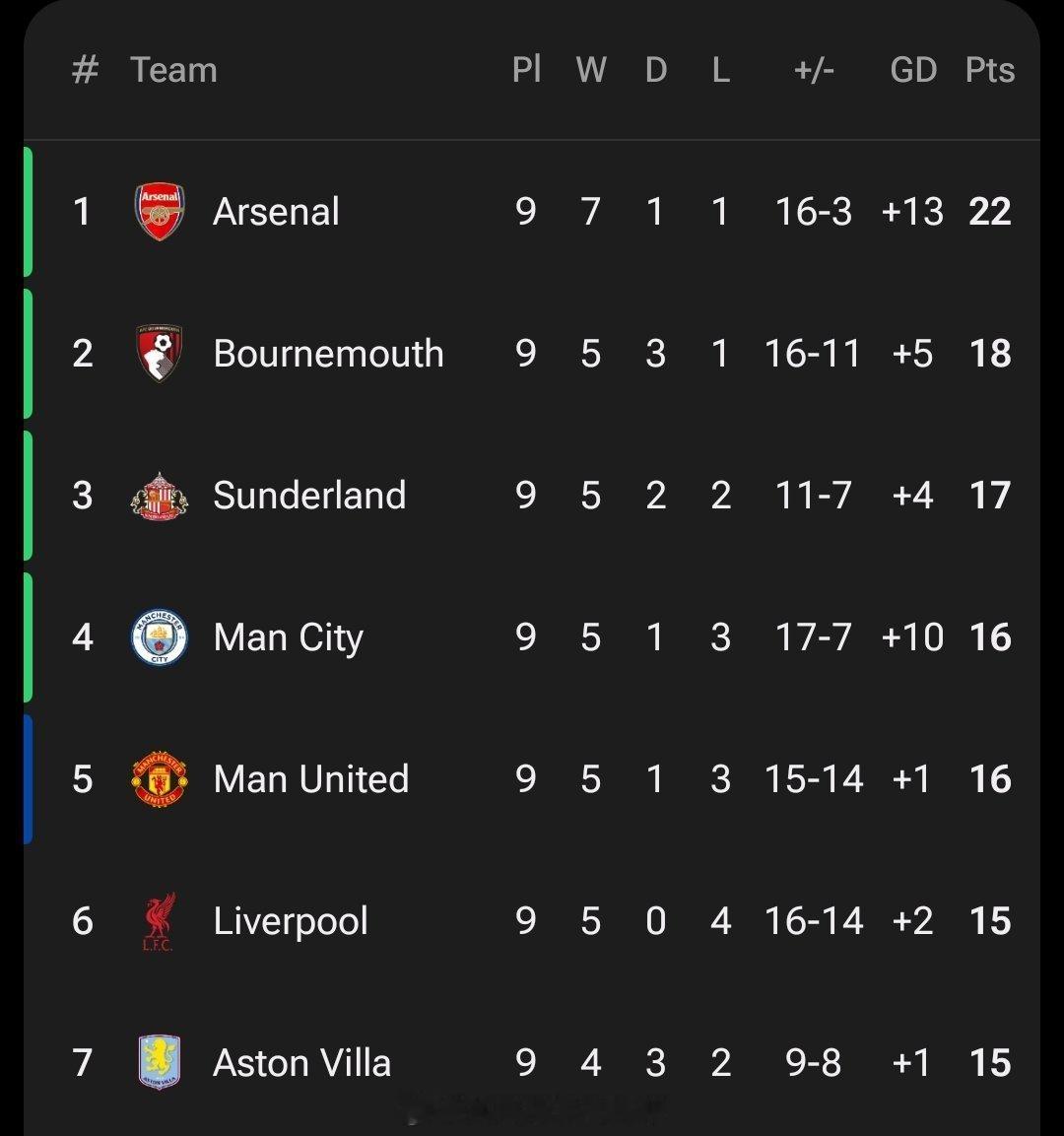 【英超积分榜最新形势】英超联赛9轮比赛过后,积分榜的最新形势:阿森纳榜首领先优势扩大,热刺升上前三,两大黑马伯恩茅斯和桑德兰位居前四,三连胜的曼联杀入前六,四连败的利物浦跌至第7位,切尔西和纽卡斯尔分别排第9位和第12位,成绩不能令人满意!
