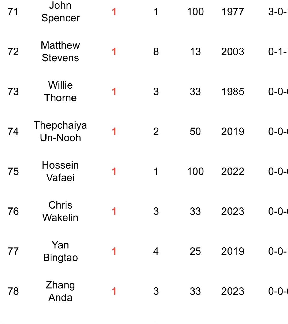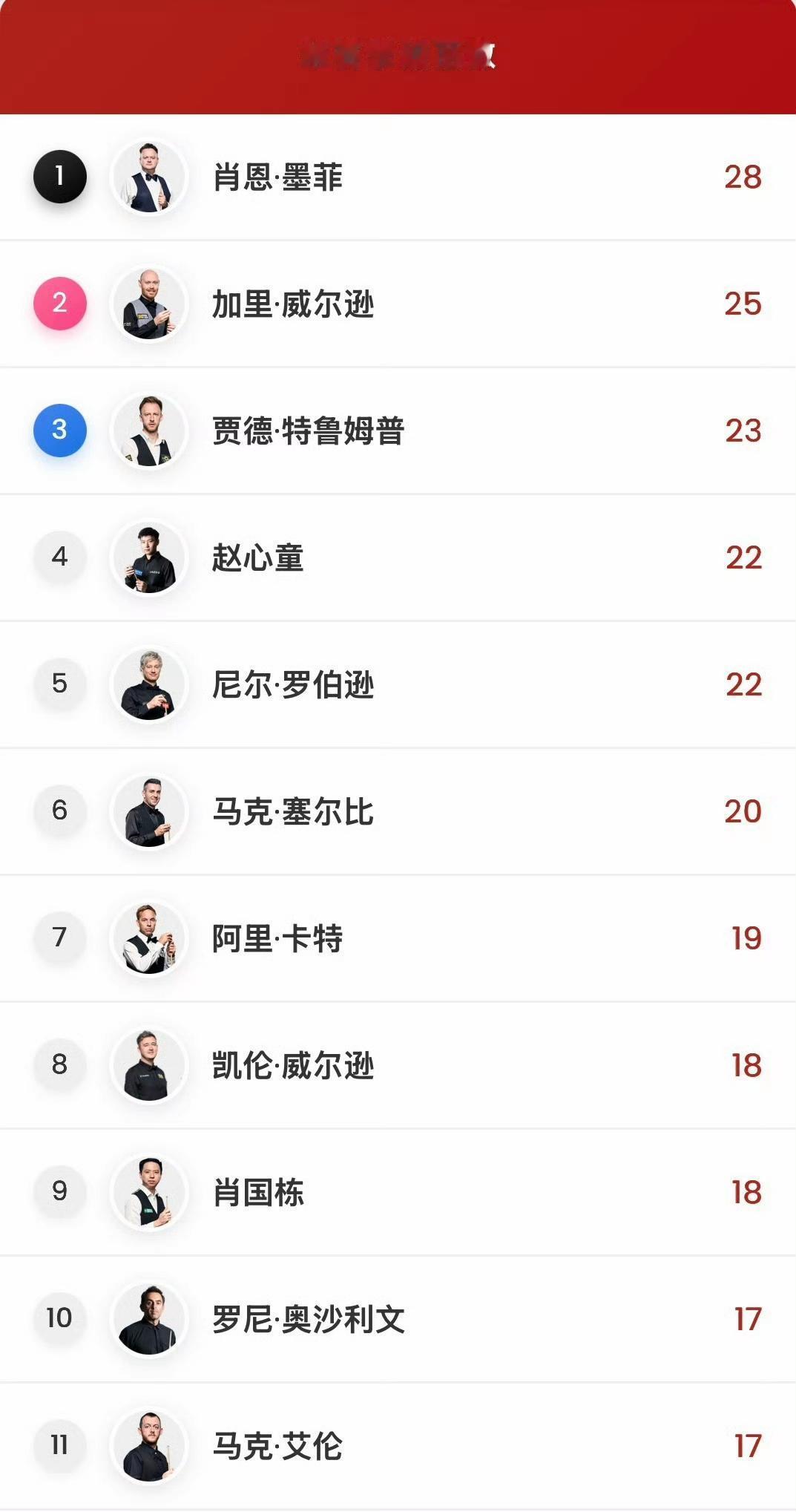 七进排名赛决赛,终于夺冠!利索夫斯基终于加入这份冠军名单了!他是斯诺克历史上第79位获得排名赛冠军的球员,排在张安达后面。 千年老二的帽子归属周跃龙了,何时能摘除呢? 北爱尔兰公开赛结束后,本赛季破百排行榜也出来了,墨菲稳居榜首,特鲁姆普第三。