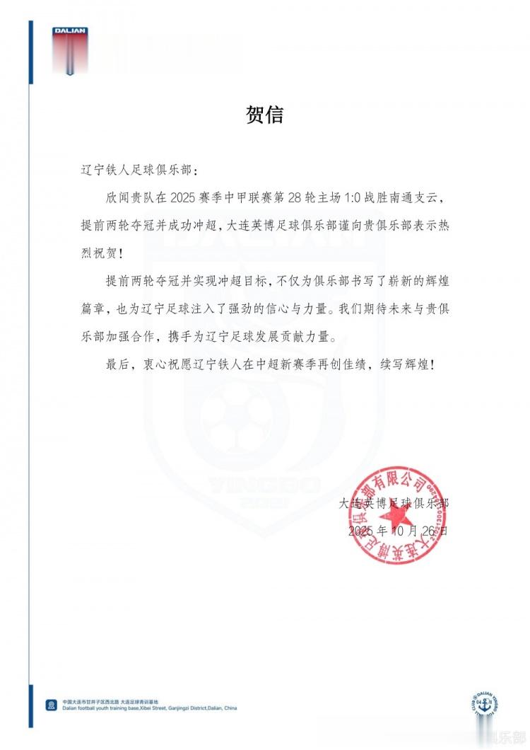 直播吧10月27日讯中甲第28轮,辽宁铁人1-0战胜南通支云,提前两轮冲超成功,锁定冠军!大连英博俱乐部发贺信祝贺辽宁铁人足球俱乐部冲超成功!