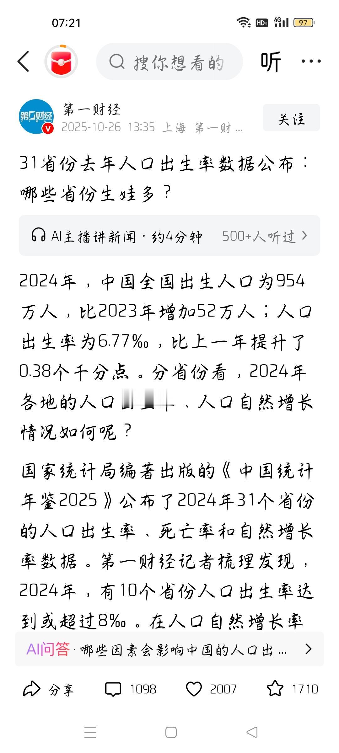 31省份去年人口出生率数据公布,我想说 据第一财经报道,2024年,中国全国出生人口为954万人,比2023年增加了52万人,人口出生率为6.77‰,比上年提升了038个千分点,我想说,人口在增长,比上年增加是好事,说明了党和政府的生育政策好,一些地方采取了鼓励生育政策,而且今年发放了生育补贴,免了一年幼儿保育费用。个人认为,随着政策的出台,中国的人口会缓慢增长,个人认为,这符合中国的国情。当然现阶段出现了不婚不育的现象,这一现象不能助长,党和政府要出台相关政策,鼓励和处罚并进。各位条友认为呢?