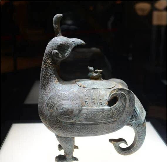 晋国定然视凤鸟为吉祥之鸟,多件青铜器物上有凤鸟纹饰。那件青铜鸟尊,则是一只青铜“彩”鸟,其实是鸟和象的复合体。鸟尊高39cm,算得上大鸟了,一只伫立回首的大凤鸟。其头高冠,凤尾下弯,恰如象鼻象头,而象鼻内卷,与双足正好形成三点支撑。器皿上有纹片,有的如羽,有的如云。象头有眼,年代久远,略模糊了些,似乎犯困,显得更为淡定沉稳。更奇的是鸟背上立了一只雏鸟,凤鸟回首与雏鸟凝望,很有些母子情深的意味。