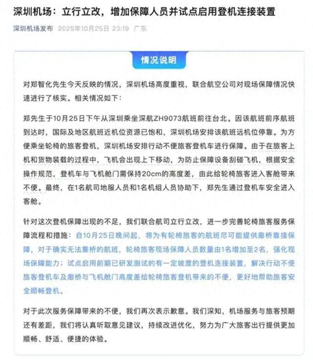 事件发酵后,深圳机场官方微博于当日傍晚发布声明,向郑智化致歉,并表示已启动核查。25日深夜11时许,深圳机场微信公号发文表示,机场联合航司立行立改,进一步完善轮椅旅客服务保障流程和措施:自10月25日晚间起,将为有轮椅旅客的航班尽可能提供廊桥靠接保障,对于确实无法靠桥的航班,轮椅旅客现场保障人员数量由1名增加至2名,强化现场保障能力。
