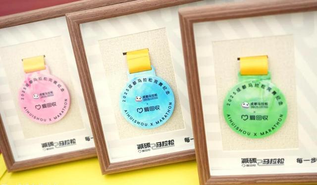 活动中,爱回收推出的“参与回收,赢取环保奖牌”互动环节,则将抽象的减碳概念转化为可感知的绿色成果。跑者通过投递可回收物,即可有机会亲手将再生塑料瓶盖改造为独一无二的环保奖牌和定制相框,将“回收”行为与“减碳”成果具象化的生动体现,让每位参与者亲历资源循环再生的闭环,深刻理解自身行动对环境保护的积极意义。