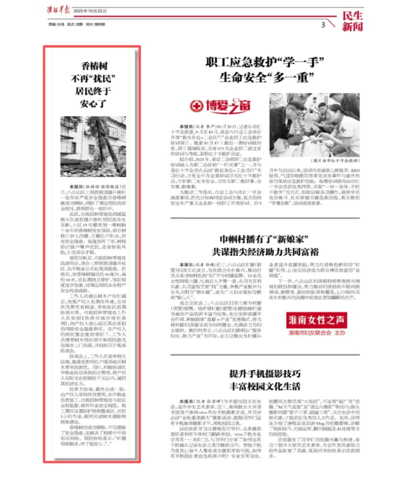 本报讯(杜婧婧摄影报道)近日,八公山区土坝孜街道建井新村一处存在严重安全隐患的香椿树被成功移除,消除了周边居民的安全担忧,获得群众一致好评。