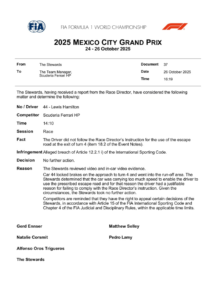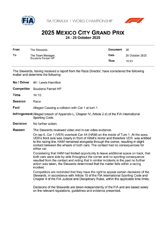 考虑到汉密尔顿在赛道上缺乏机会去留下额外空间,两车在整个弯角中始终保持并排,且接触未产生任何赛事后果,同时注意到过往类似事件均未采取进一步处理,赛事仲裁判定此事属于赛道事故。