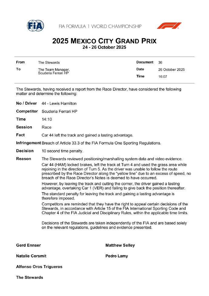 根据标准规定,离开赛道并获得持久优势的处罚是加罚10秒,因此裁判组决定予以实施。