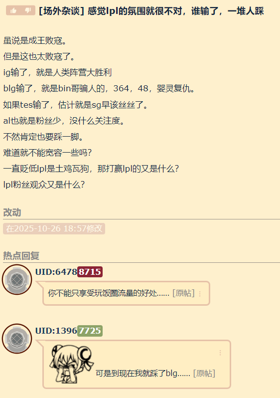 感觉LPL的氛围就很不对,谁输了,一堆人踩。英雄联盟s152025全球总决赛