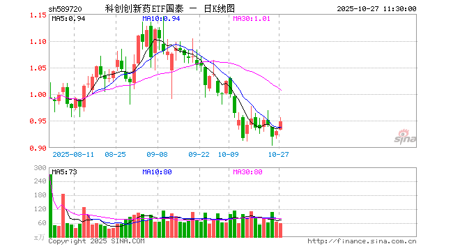 10月27日,截止午间收盘,科创创新药ETF国泰(589720)涨2.04%,报0.949元,成交额5612.09万元。科创创新药ETF国泰(589720)重仓股方面,博瑞医药截止午盘涨4.03%,百济神州涨2.93%,百利天恒涨1.56%,泽璟制药涨2.01%,艾力斯涨4.90%,君实生物涨2.49%,益方生物涨1.19%,神州细胞涨1.88%,特宝生物跌1.00%,荣昌生物涨3.86%。