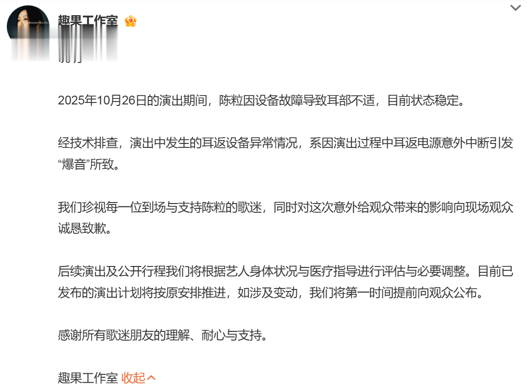 10月27日,陈粒工作室@趣果工作室发布情况说明:经技术排查,演出中发生的耳返设备异常情况,系因演出过程中耳返电源意外中断引发“爆音”所致。同时,工作室对这次意外给观众带来的影响向现场观众诚恳致歉。