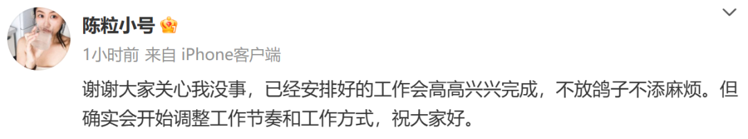 随后,@陈粒小号发文回应:谢谢大家关心我没事,已经安排好的工作会高高兴兴完成,不放鸽子不添麻烦。但确实会开始调整工作节奏和工作方式,祝大家好。