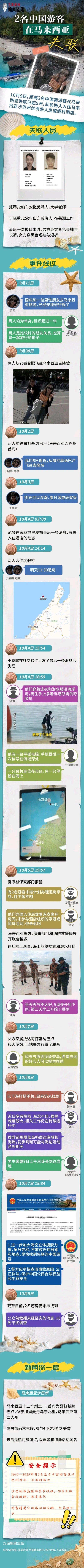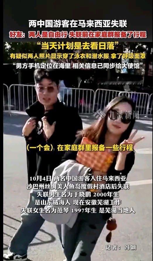 两名中国游客在马来西亚美人鱼岛失联这事闹得沸沸扬扬。失联男生于晓鹏是2000年山东威海人,在安徽芜湖工作,女生范琴是1997年芜湖当地人。 家属看到两人失踪前监控,还在失联男生酒店包里找到耳机,可之前男生朋友通过平板定位耳机在海里。他们10月4日到岛上,监控显示16时33分两人从房间出来,之后画面因电压不稳缺失。当天17时网友看到疑似他们在近岸浮潜,17时40分有人在餐厅外和男生对视。希望能早日有他们的准确消息,平安归来。