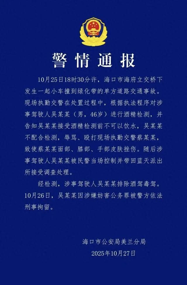 海口市公安局美兰分局10月27日通报,一名男子在交通事故处置中拒不配合酒精检测,辱骂并殴打执勤交警,已因涉嫌妨害公务罪被依法刑事拘留。(记者畅凯编辑黄羽洁)