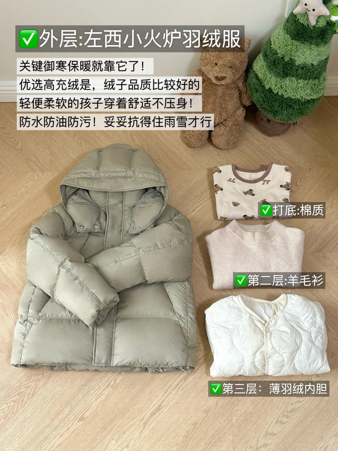 🧥上装:打底内衣+羊毛衫+羽绒内胆+高充绒羽绒服