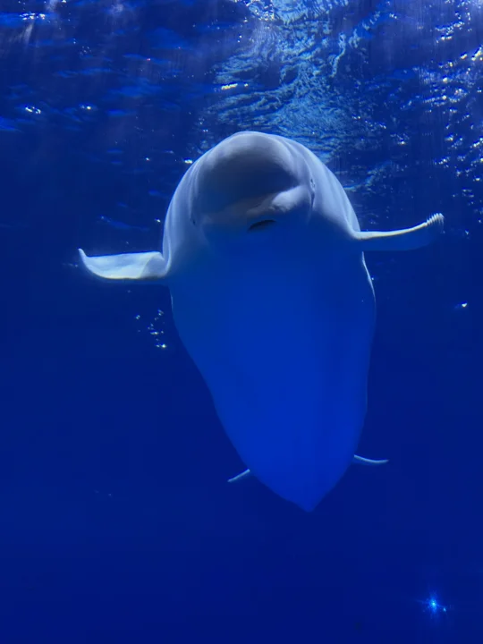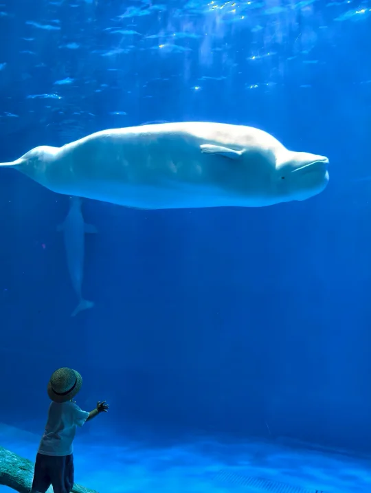 ✅鲸鱼湾:刚进门就被两大只白鲸惊艳到!它们会主动游到玻璃前“贴贴”,吐泡泡、转圈超可爱,光线柔和也很好拍照