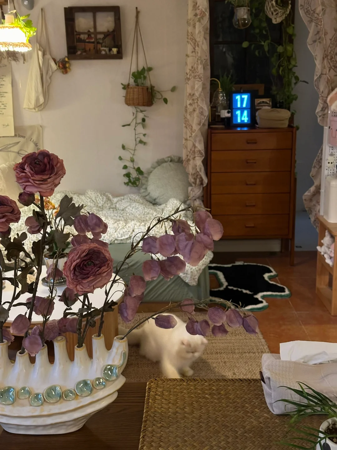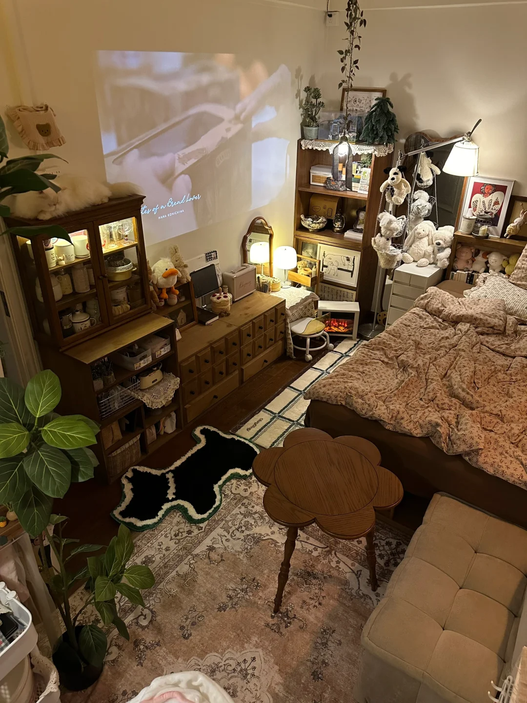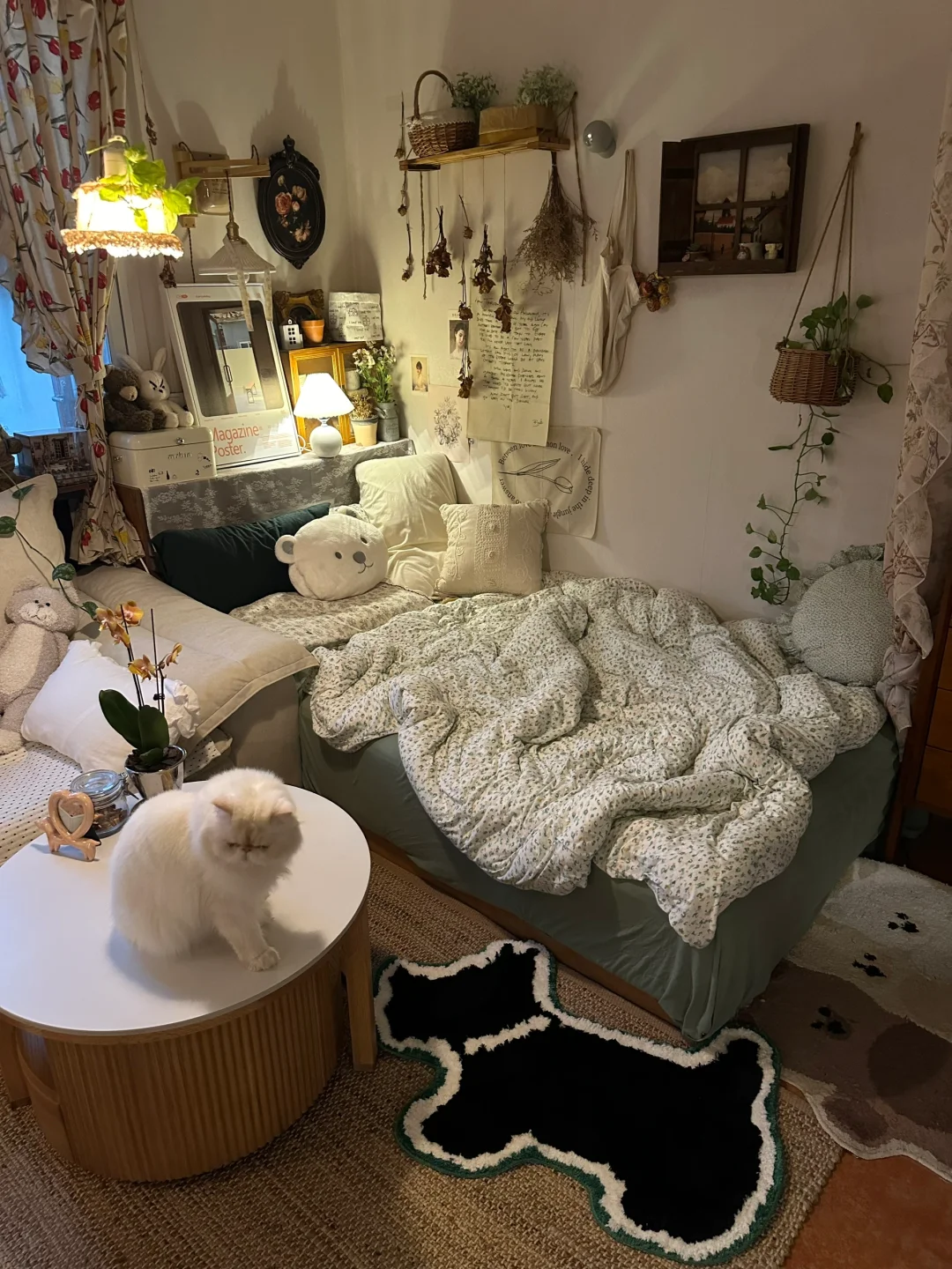 珍珠小狗的地垫让床边多了些亮眼的绿