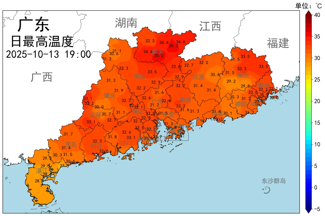 在10月19日冷空气到达之前,14日~19日中午,广东将持续受副高影响,全省以晴天到多云为主🌞,局部下午有“开水雨”,全省最高温将剑指35-36度🔥🔥,“秋老虎”继续强势,广东伙伴要做好防暑~防晒~防蚊。