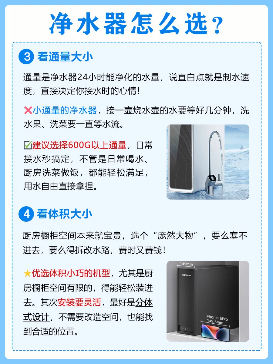 😫选净水器真的踩碎坑!😂先买的大体积款,阳台占地还落灰;😤换了小的又被接水速度逼疯,煲汤接水站到腿酸;更气的是滤芯半年一换,一年耗材钱比机器还贵!📝整理了一份净水器选购指南,新手小白一定要看完!