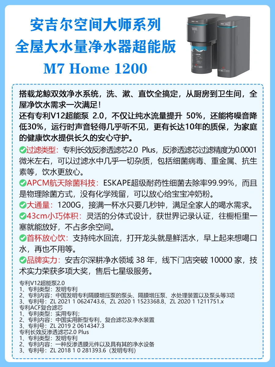 👉🏻看完还不知道怎么选的姐妹,可以跟着我闭眼冲安吉尔空间大师系列全屋大水量净水器超能版M7 Home 1200~👍🏻搭载龙鲸双效净水系统,洗、漱、直饮全搞定,从厨房到卫生间,全屋净饮水需求一次满足👏🏻还有专利V12超能泵 2.0,不仅让纯水流量提升 50%,还能将噪音降低 30%,运行时声音轻得几乎听不见,更有长达 10 年的质保,为家庭的健康饮水提供长久的安心守护。