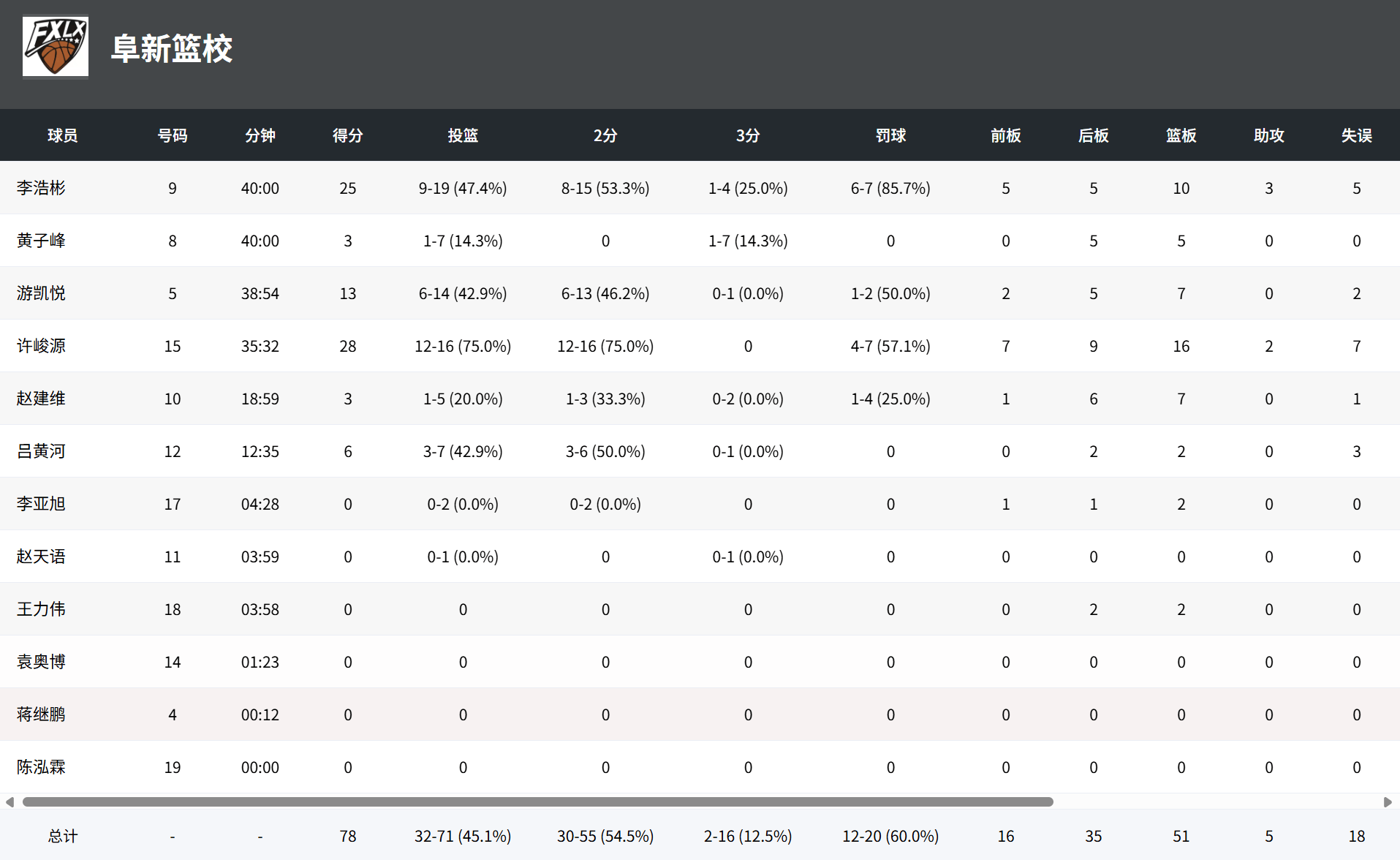 阜新篮校:许峻源28分16篮板、李浩彬25分10篮板、游凯悦13分7篮板