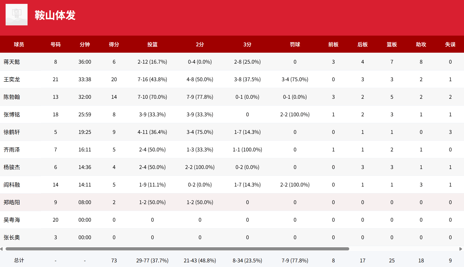 鞍山体发:王奕龙20分、陈勃翰14分、徐鹤轩9分