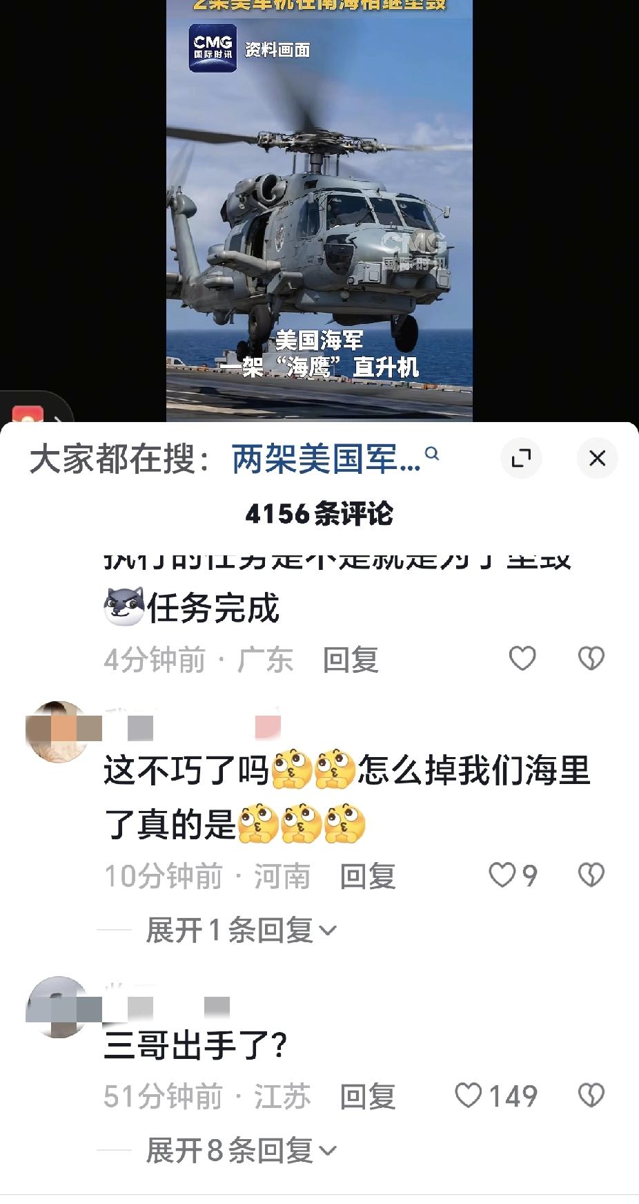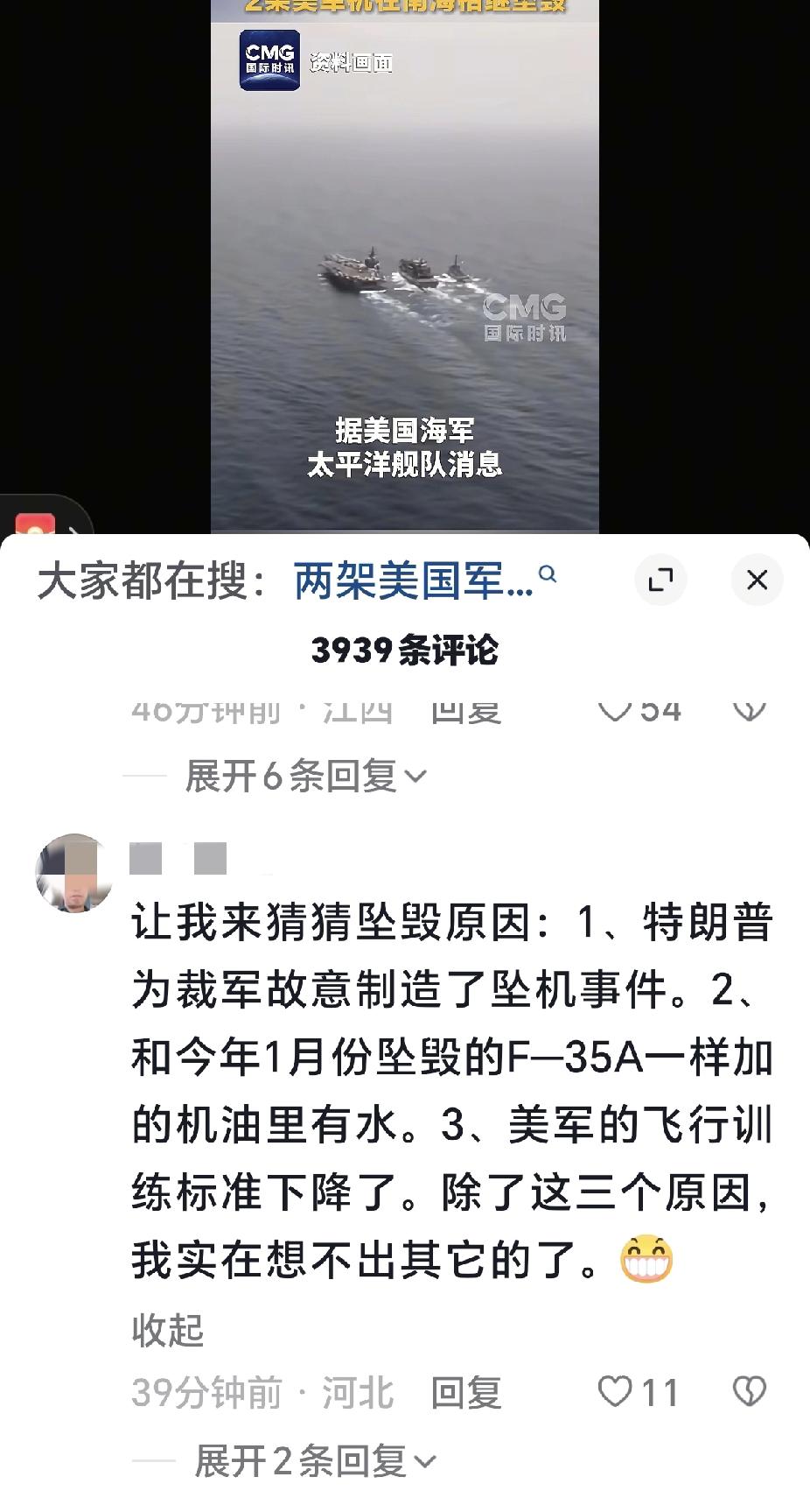 美两军机在南海坠毁,新闻区评论很有意思。 网友一:菲律宾干的! 网友二:三哥,你