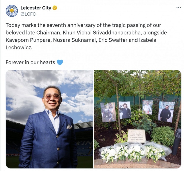 莱斯特城社媒晒出维猜的照片,写道:“今天是我们敬爱的已故主席维猜,以及蓬帕莱、·苏克纳迈、斯瓦弗和莱霍维奇不幸离世的七周年纪念日。永远在我们心中。”