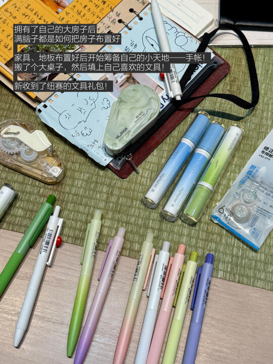 家具、地板布置好后开始筹备自己的小天地——手帐!搬了个大桌子,然后填上自己喜欢的文具!